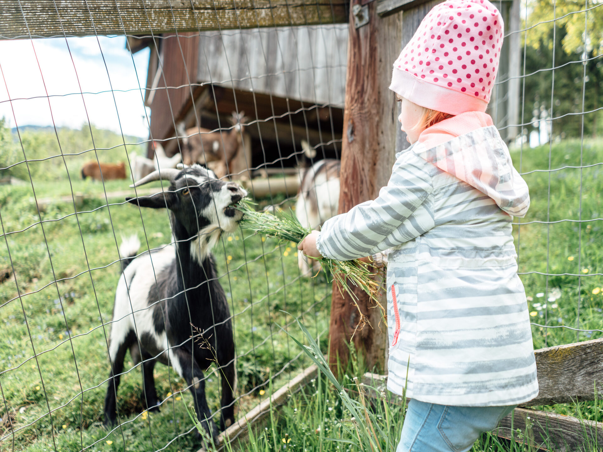 Die Aufsicht übernehmen die Eltern, aber keine Sorge: Unser Hof ist so angelegt, dass Kinder sicher spielen und die Tiere kennenlernen können.